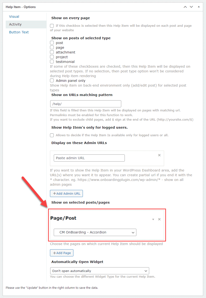 Next, we choose the where the widget will be displayed. The plugin allows to create a specific widget for each post/page, front-end or back-end URL, post type or make the widget global.